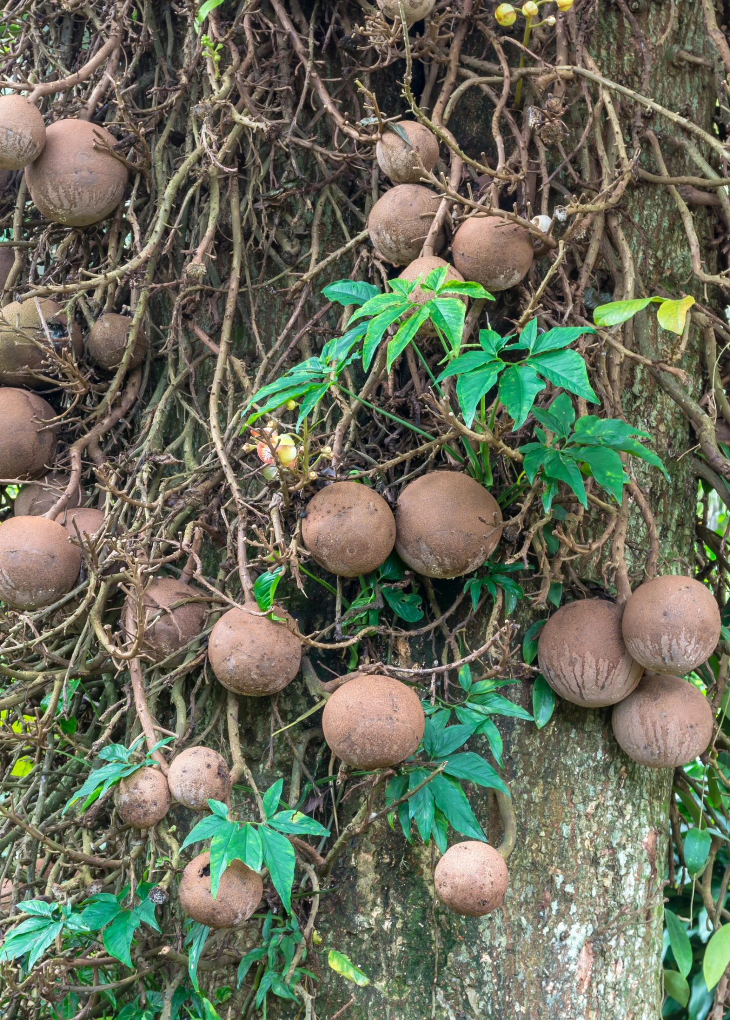 Flowers: The Cannonball Tree is best known for its extraordinary, fragrant flowers. These flowers, which grow directly on the trunk and older branches, are large and spherical, resembling cannonballs. Each flower is comprised of vivid pink to red petals with intricate patterns and exudes a sweet, enticing fragrance. These blooms are a sight to behold and often attract pollinators like bats and insects.