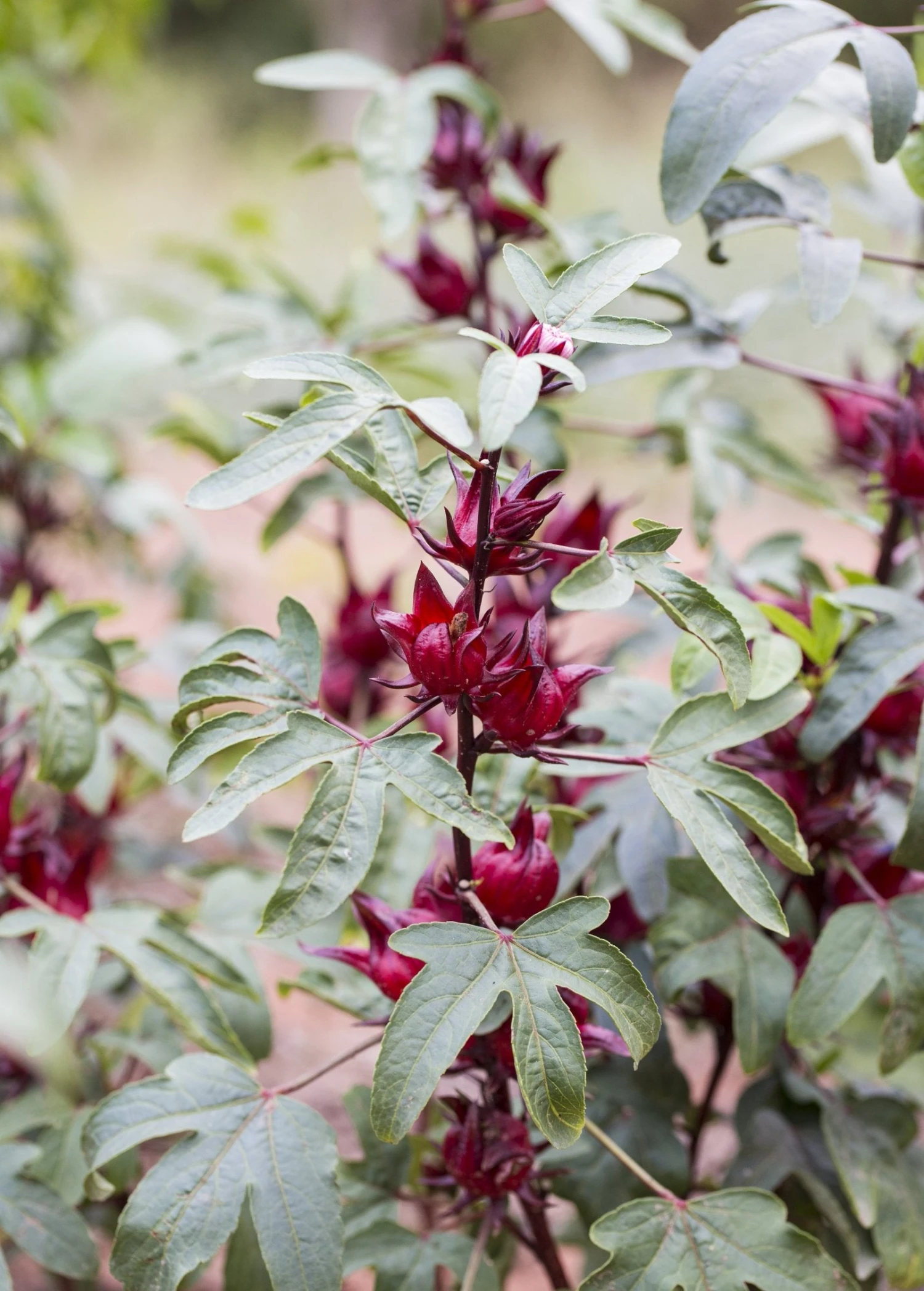 Florida Cranberry is grown around the world and is known by many names, including Roselle, Jamaican Sorrel, Fleur de Jamaica or Gongura. It’s loved for its edible leaves and succulent bright red flower calyxes. The culinary “fruit” is actually the enlarged flower calyx. It has a crisp apple-like texture and a tart cranberry-like flavor. When brewed as a tea, it has a beautiful bright red color.